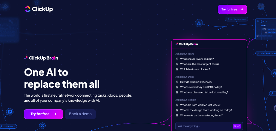 ClickUp Brain integrates AI capabilities directly into the ClickUp project management platform, offering intelligent assistance for task management, content creation, and workflow optimization. ClickUp Brain not only saves you precious time by instantly summarizing articles, it also leverages AI to connect your tasks, docs, people, and more, streamlining your workflow like never before. This integration makes it particularly valuable for teams using ClickUp for project management.