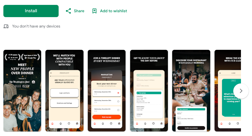 Unlike traditional dining apps, Timeleft focuses on curating dinner parties with carefully matched strangers based on compatibility, interests, and conversation potential.