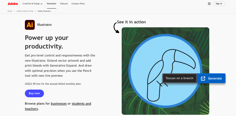 This software has terrific collaboration tools. Some of its basic features include shape tools, pathfinders, gradients, pen tool, and more.
