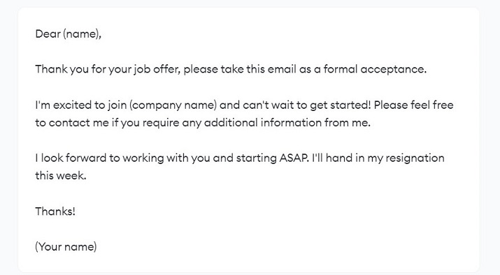 In this email template, the sender is thanking the employer while simultaneously accepting the offer and sharing how enthused they are to begin their new role.