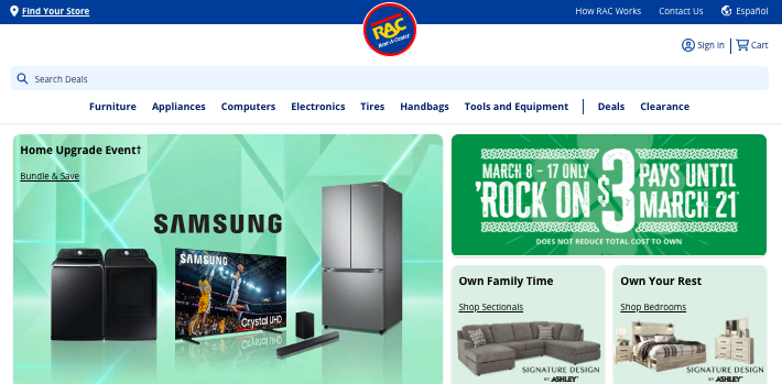 Rent-A-Center is a rent-to-buy company selling furniture, electronics, bikes, appliances, and more.