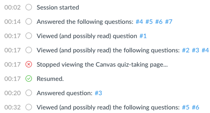Canvas provides test administrators with basic logs displaying the activity of the test taker, including when they answered a question. Most notably, however, Canvas has a built-in feature that allows test administrators to see when a student has left the page.
