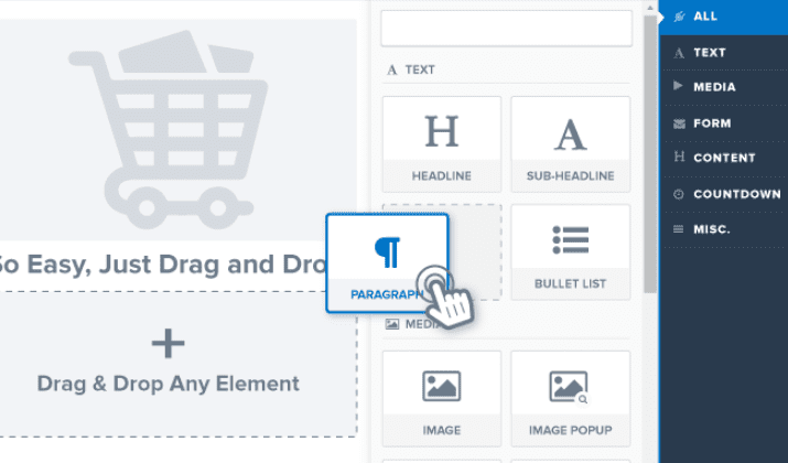 However, ClickFunnels does offer some more elements to insert on the page including FAQ sections, surveys, navigation options, progress bars, shopping cart option and more.