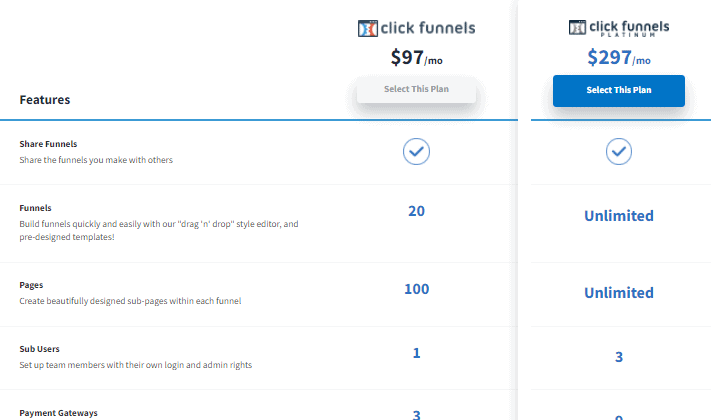 The main difference with the Click Funnels and Click Funnels Platinum plan is that you can build unlimited pages, tunnels, and follow-up funnels with Platinum.