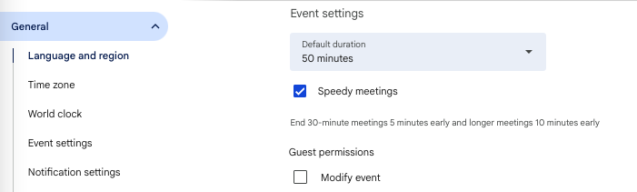 You can turn this on under Settings > Event settings > Speedy meetings. Those extra five or ten minutes might not sound like much, but they give you precious breathing room to grab water, jot down notes, or simply reset before your next call.