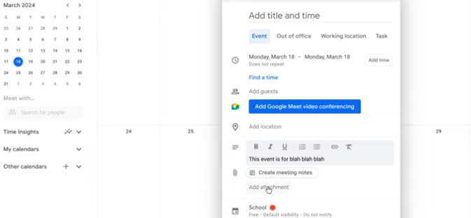 Google Calendar allows you to attach documents, slides, or sheets directly to an event, so everything you need is right there.