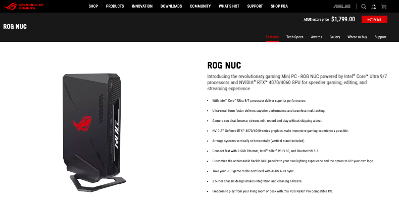 Priced over $2k, it provides a high-performance gaming experience in a compact package. ASUS’s commitment to quality and innovation is evident in the ROG NUC’s design and performance.