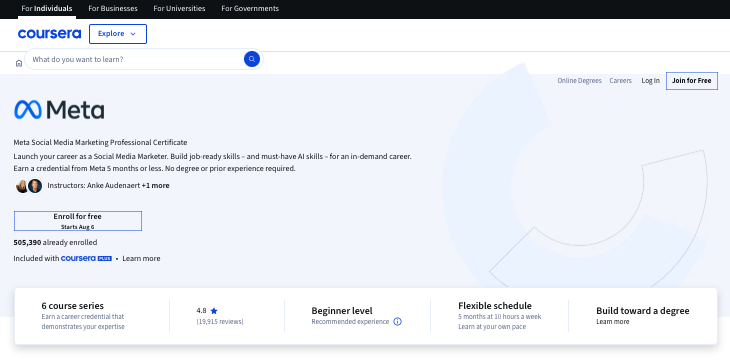 Created by Meta, this course provides a solid foundation in content strategy, social advertising, community management, and campaign analysis. Teachers with strong communication skills can pivot to digital marketing roles that value creativity and audience engagement.