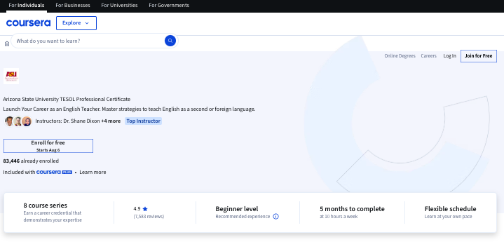 Prepares you for ESL teaching positions in schools, language institutes, or virtual platforms