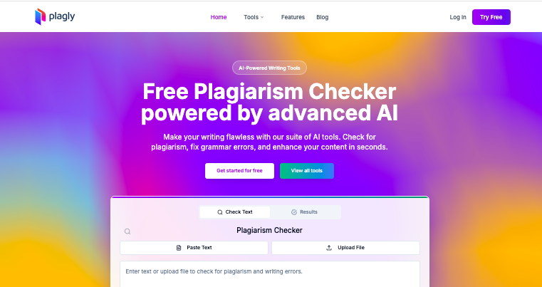 Plagly offers an unlimited free plagiarism checker powered by AI with no signup required, making it one of the most accessible options available. The tool provides comprehensive originality scores and source identification with percentage-based reports.