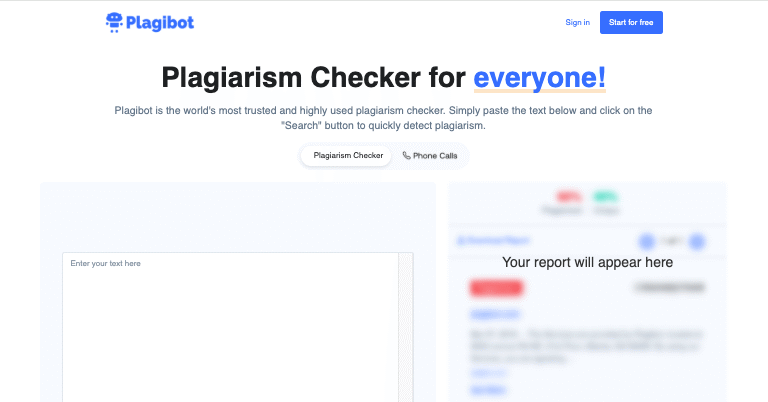 Plagibot offers a sophisticated plagiarism detection service with both free and paid tiers. The tool provides comprehensive plagiarism analysis with an intuitive interface designed not only for educators but professionals in other fields too.